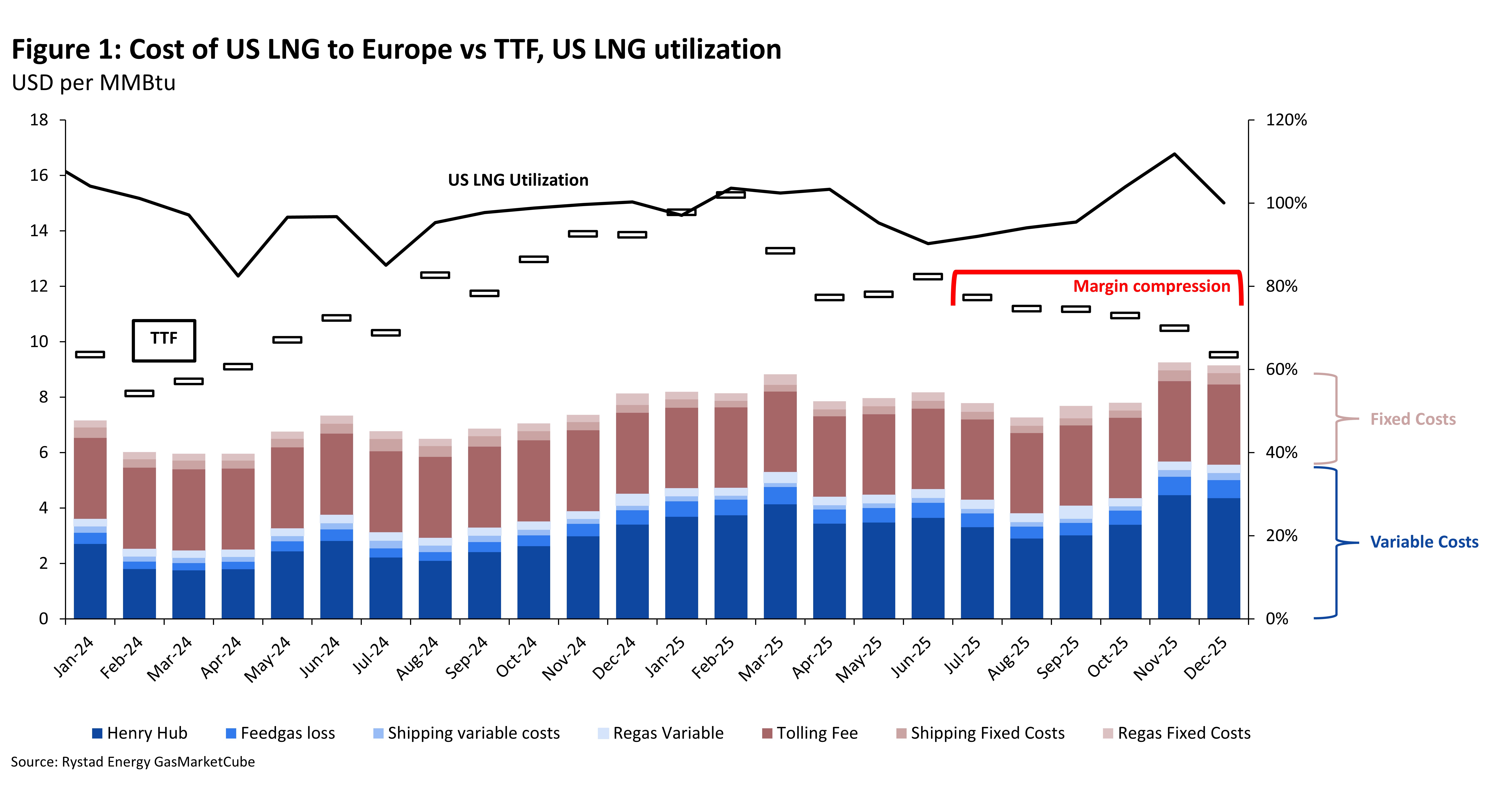 The average margin on a US Gulf coast (USGC) cargo destined to Europe, including regasification costs, was $4.56 per million British thermal units (MMBtu) between 2023 and 2025, or $17.5 million per one LNG vessel, compared to negative margins prior and during the pandemic in 2019 and 2020. These attractive profits have spurred national oil companies and majors, sovereign wealth funds, private equity, Asian utilities and other energy buyers to flock to the USGC with their checkbooks to get in on the action. As a result, a flurry of LNG final investment decisions (FID) has been undertaken during this period, both from greenfield and brownfield projects. The notion of the incoming LNG oversupply has deterred very few investors, despite rising risks of low prices. Yet, this bullish perception began to get questioned on 5 December when the TTF-Henry Hub differential collapsed to $4 per MMBtu, the lowest spread seen since April 2021. The industry reported squeezed margins, with TTF approaching the full costs of US LNG delivered to Europe (Figure 1), and fears of production shut-ins if the differential continued to drop.