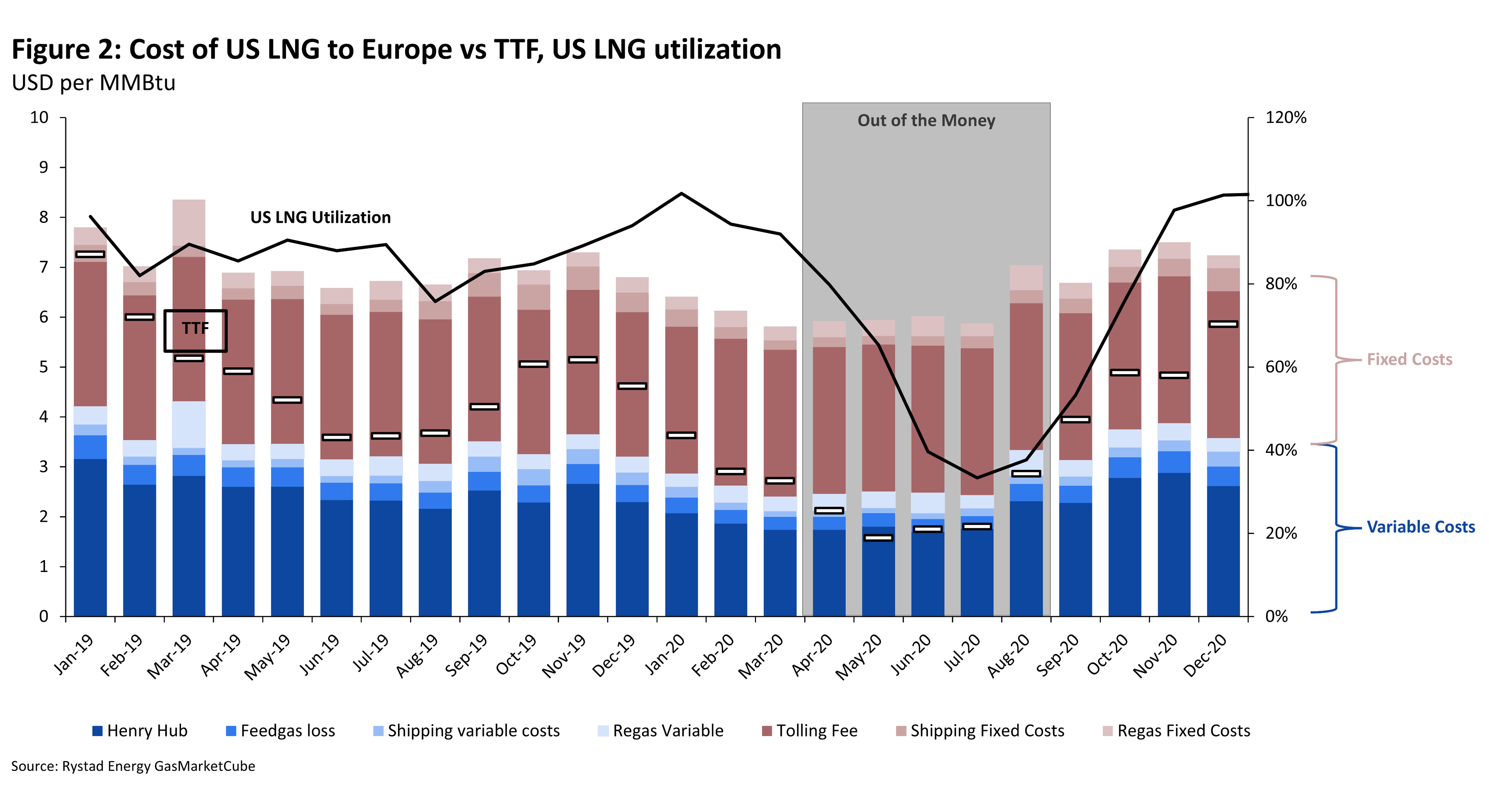 SRMC is broken down into the following segments: 1) the cost of feedgas (Henry Hub); 2) 115% of the cost of feedgas to cover liquefaction losses and profit to the LNG developer; and 3) variable costs of shipping and regasification. While fixed costs include: 1) the tolling fee of LNG offtake contracts, which hovers around $2.5 per MMBtu; and 2) fixed shipping and regasification costs. Note that there is some nuance with shipping and regasification costs depending on business models – if offtakers own a fleet or vessels or regasification capacity. The economics are as follows: the TTF-Henry Hub spread must be sustained below the variable costs of US LNG delivered to Europe (feedgas losses, variable shipping and regasification) for a 1–2-month period for US LNG cargo cancellations to materialize. Variable costs, in a balanced market, are around $1 per MMBtu to Europe and $1.5 per MMBtu to East Asia.