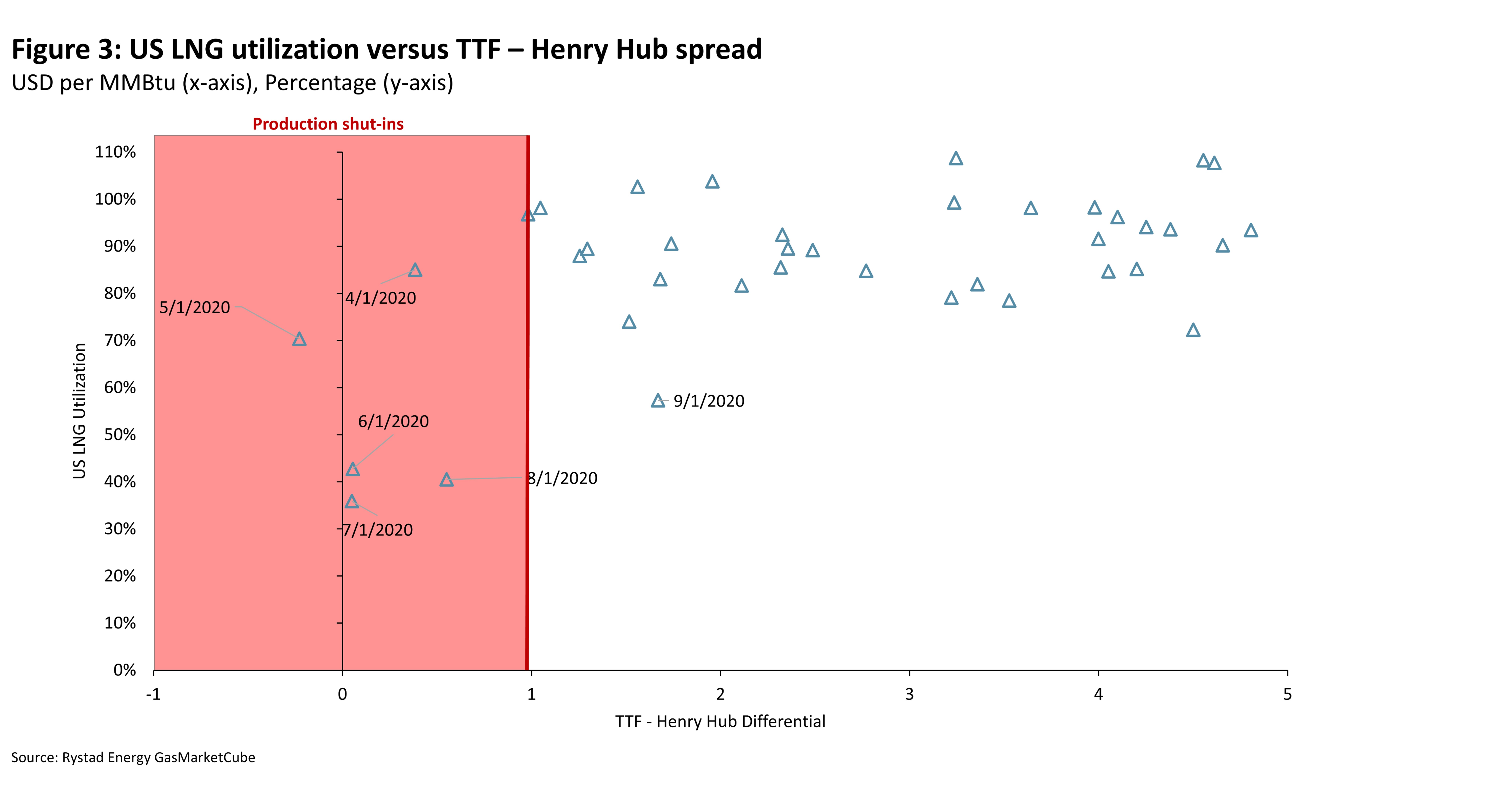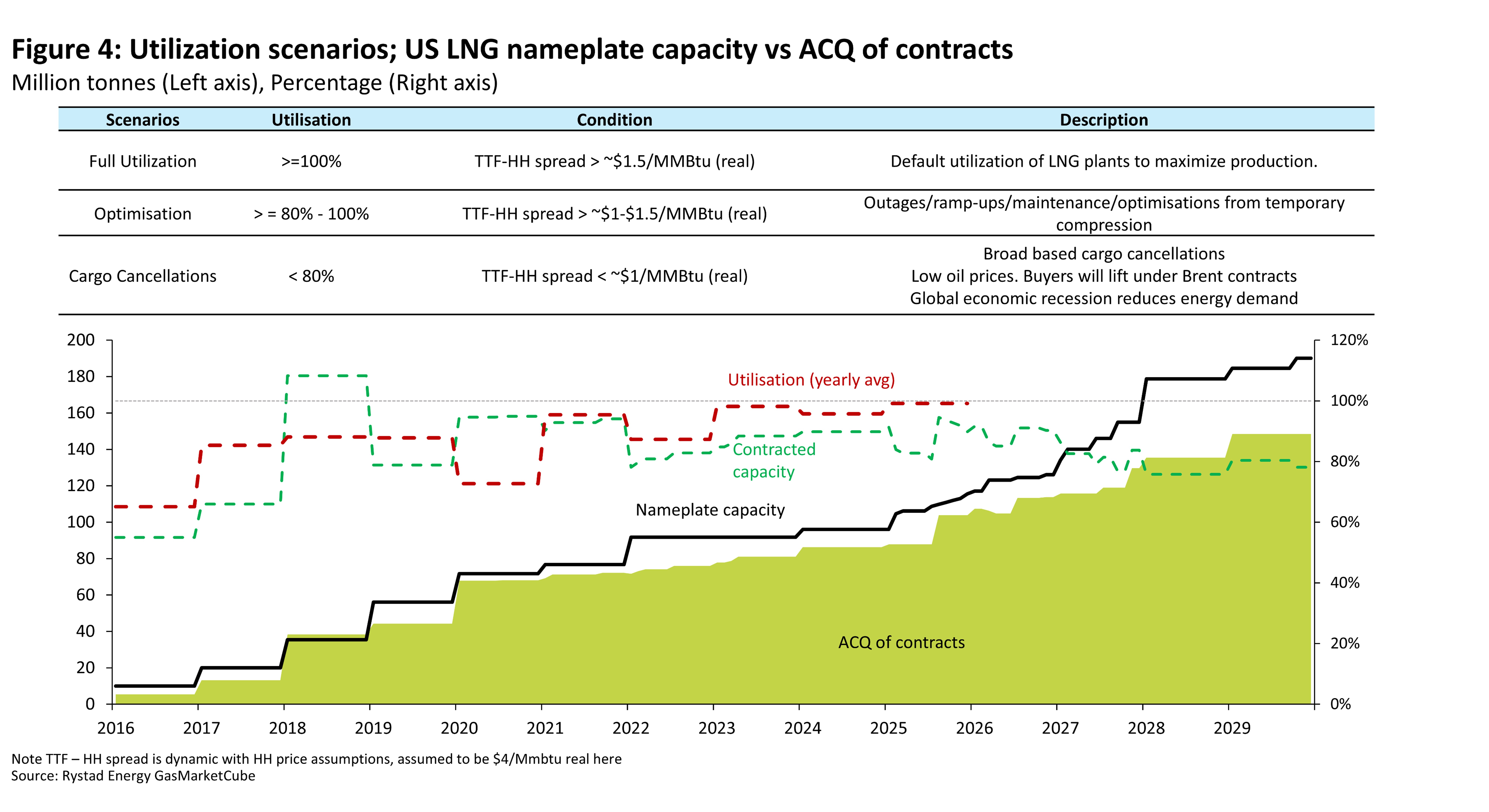 The second scenario outline is seen when US LNG utilization shifts downwards and fluctuates between 100% and the share of contracted volumes, which hovers around 80% of full capacity. In this scenario, TTF-Henry Hub spreads fall to $1-$1.5 per MMBtu ($1.5-$2 per MMBtu for Asia) but remain above the variable costs of US LNG to Europe. Yet, they would be low enough to cause LNG developers to deploy optimizations for non-contracted LNG production and/or use the time to carry out maintenance, although optimization would be the only commercial reason to lower production.