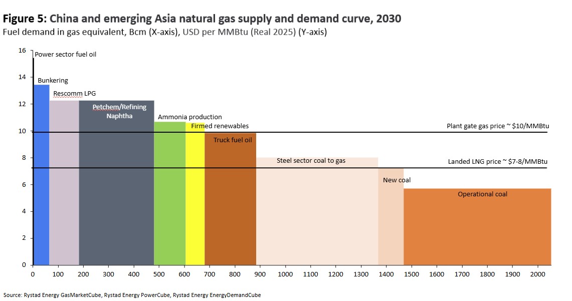 As opposed to the 2020 shut-ins induced by Covid-19, which was demand driven, the incoming downside pressure on prices will be supply driven as LNG production outpaces demand growth. Industry analysts are betting that as prices fall, price sensitive LNG demand will emerge. Historically, this has been the case, and most of the displacement comes at the expense of seaborne coal consumption. Traditionally, LNG has also displaced seaborne coal when prices are within $1-$2 per MMBtu of the seaborne coal prices, particularly in Japan, South Korea and Europe. This is due to efficiency gains of gas turbines, with combined-cycle turbines typically sitting in the range of 50-60% thermal efficiency while conventional coal-fired power plants are near 33-38%. The Newcastle coal price index fluctuated around $4-$5 per MMBtu in 2025, meaning that price sensitive LNG demand is likely to appear when prices hit the $6-$7 per MMBtu range. Europe could see incremental demand at slightly higher LNG prices, closer to $7-$8 per MMBtu as their carbon price decreases the competitiveness of coal. For reference, between Japan, South Korea and Europe, seaborne coal consumption was north of 300 Mt per annum (Mtpa) in 2025.